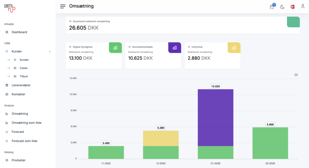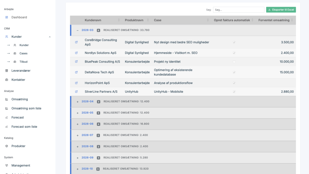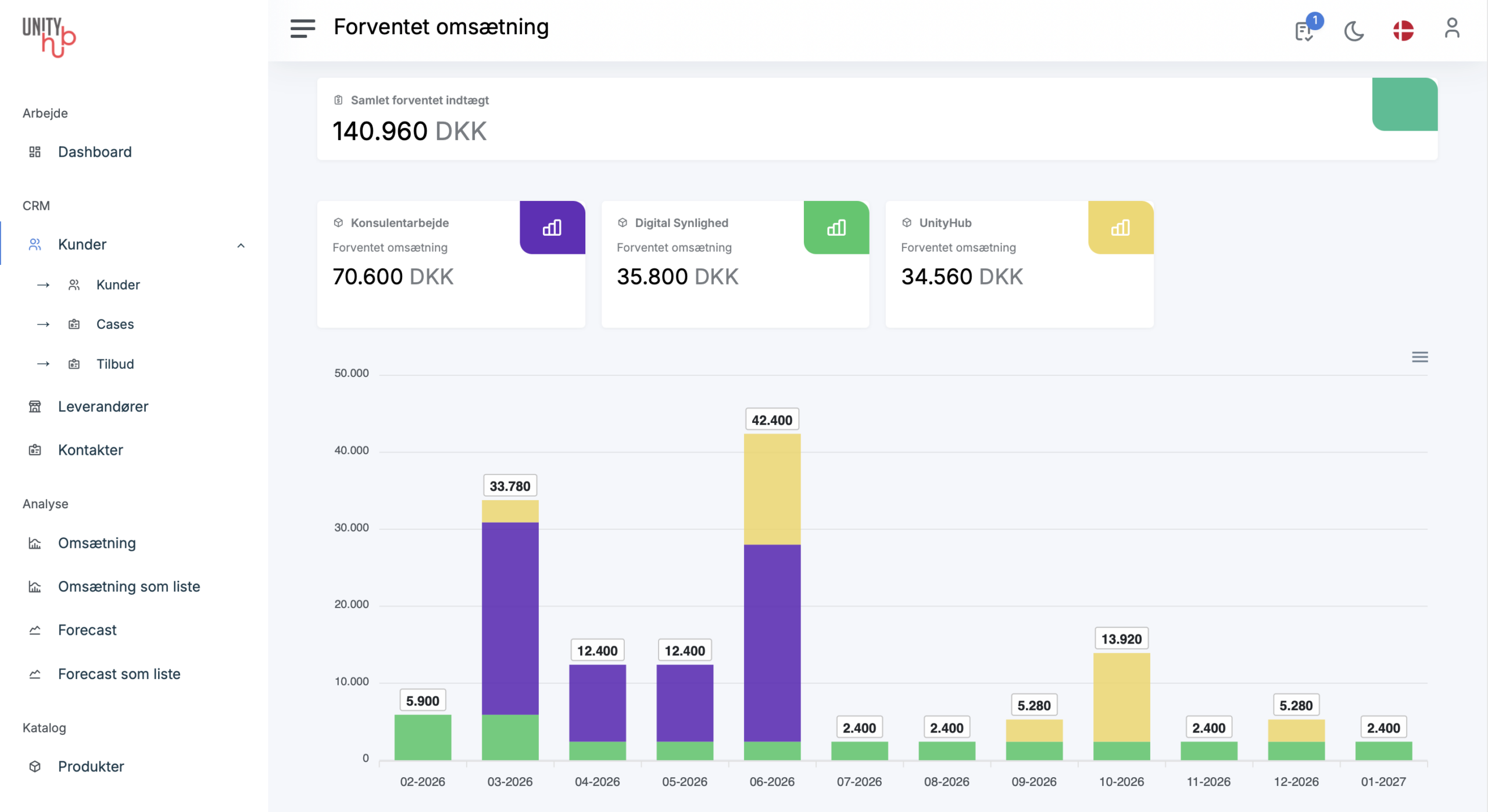 Når et tilbud bliver til en aftale, opdateres forecastet automatisk. Du kan se præcis, hvordan pipeline omsættes til fremtidig indtjening – både samlet og på det enkelte område.